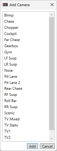 Camera groups are listed with a comma separating each one. If the iRacing simulator is running then you can click on the button with the camera icon, to have it show a list of available camera groups for the current track running in the simulator.