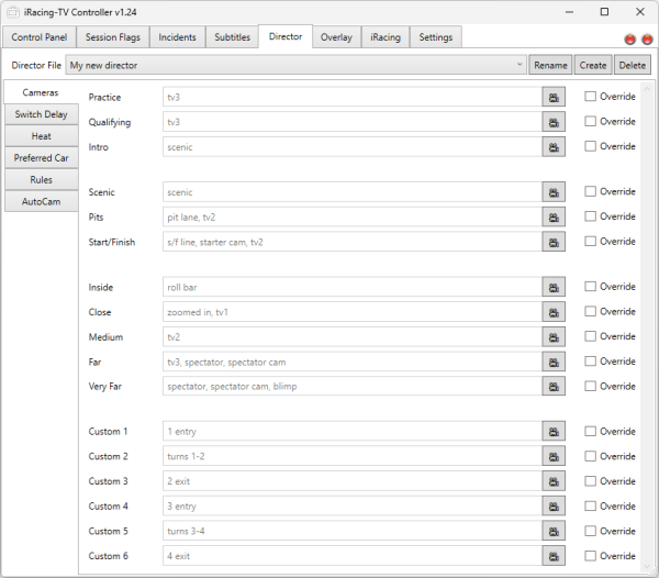 For each camera type, you can specify a list of iRacing camera groups to use with that type. If there is only one camera group listed for a camera type, then it will always use that camera group whenever that camera type is active. If there are multiple camera groups listed for a camera type, then the director will randomly choose one of them each time the target driver changes.