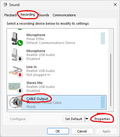 Switch to the “Recording” tab, find and select the “CABLE Output” sound device, and then click on the “Properties” button.